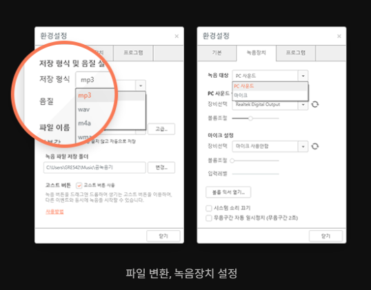 좋아하는 음악, 중요한 강의, 나의 목소리 등 녹음하고 싶은 소리와 포맷을 클릭 한 번으로 간편하게 설정 가능합니다.