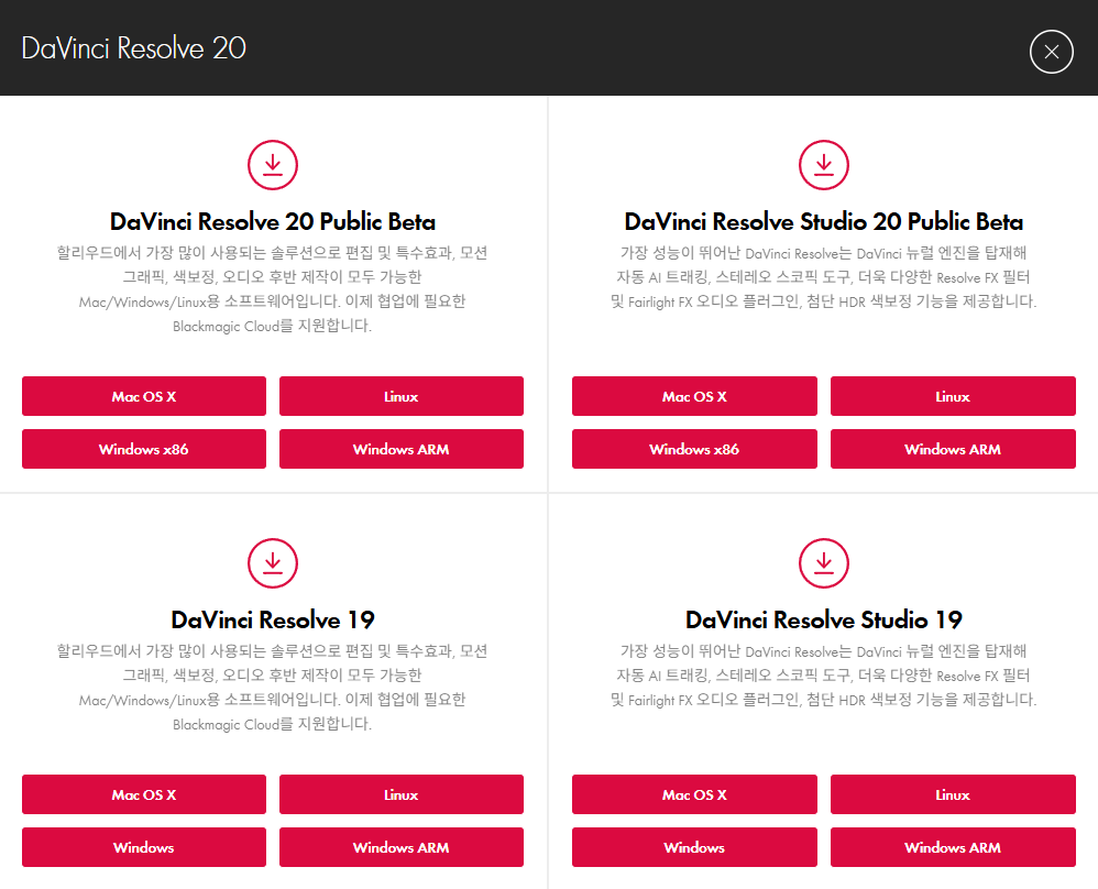 - 버전 선택 및 다운로드:페이지에서 'DaVinci Resolve' 무료 버전을 선택하고, 사용 중인 운영체제(Windows, macOS, Linux)에 맞는 버전을 클릭하여 다운로드합니다. 이메일 등 간단한 정보를 입력해야 할 수 있습니다.